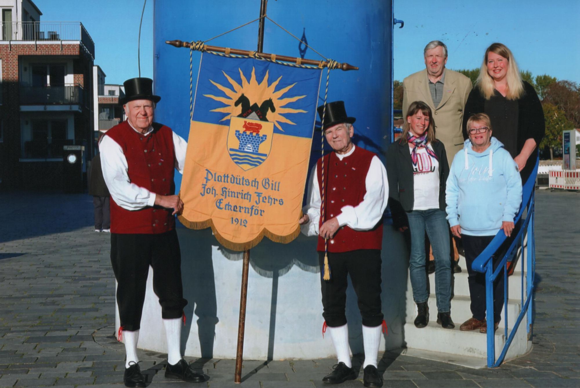 v.li. Uwe Schumacher und Klaus Steen (Beirat), Andrea Hardt (2.Vörsitterin), Christel Fries (Vörsitterin), Sönke Jensen (Kasserer), Lina Hansen (Schrieverin)